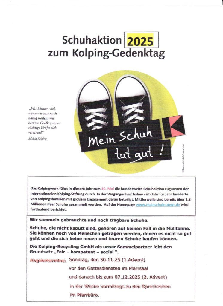 Das Kolpingwerk führt in diesem Jahr zum 10. Mal die bundesweite Schuhaktion „Mein Schuh tut gut!“ zugunsten der internationalen Kolping-Stiftung durch. In der Vergangenheit haben sich Jahr für Jahr hunderte Kolpingsfamilien mit großem Engagement daran beteiligt. Mittlerweile sind bereits über 1,8 Millionen Paar Schuhe gesammelt worden. Auf der Homepage www.meinschuhtutgut.de wird fortlaufend berichtet.
