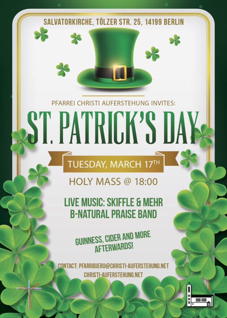 Auch in diesem Jahr wird die Pfarrei Christi Auferstehung wieder den St. Patrick’s Day in der Salvatorkirche feiern. Der Gottesdienst wird in englischer Sprache gehalten, die B-Natural Praise Band wird ihn musikalisch gestalten.