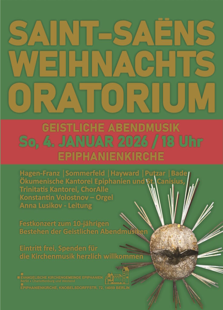Am 4. Januar 2026 um 18:00 Uhr, zwischen dem Weihnachtsfest und Epiphanias, also mitten in der Weihnachtszeit, lädt die Ökumenische Kantorei Epiphanien und St. Canisius Sie ganz herzlich ein zur Geistlichen Abendmusik in der Epiphanienkirche mit dem Weihnachtsoratorium von Camille Saint-Saëns. Dieses Stück, eine Art Geniestreich des noch jungen Saint-Saëns, bringt die Weihnachtsgeschichte in Berührung mit Texten aus dem alten und neuen Testament.