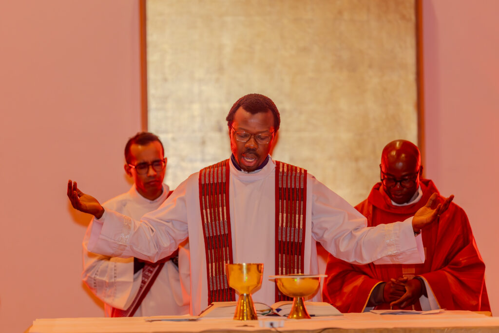 Im Altarraum waren viele rot gekleidete Ministranten und Zelebranten. Letztere kamen aus verschiedenen Ländern: Togo, Indonesien, Ghana, Bayern und natürlich Berlin, vertreten durch die einzige Pfarrerin, Ramona Rohnstock von der evangelischen Epiphaniengemeinde. Pfarrer Gerald Tanye SVD leitete den Gottesdienst mit Kaplan Jérémie Sossou und Diakon Yohanes Paji, ebenfalls Steyler aus Heiliggeist. P. Hösl SJ steuerte die Predigt bei. Er bezog sich auf den Bestseller von Gary Chapman, der mit seinen „fünf Sprachen der Liebe“ einen Klassiker in Sachen Liebe verfasst hat.
