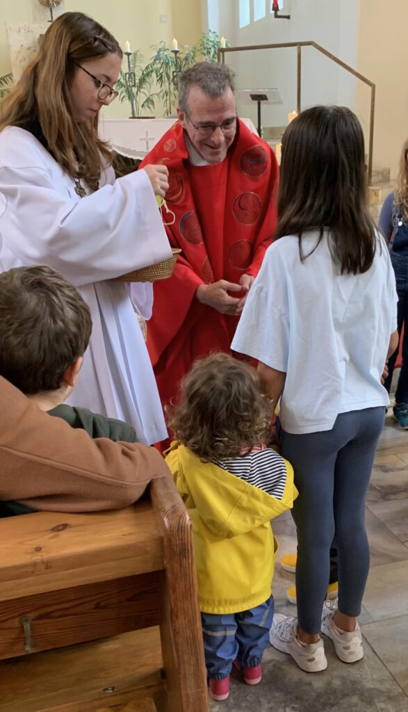 P. Maximilian hat alle Kinder eingeladen nach vorne zu kommen. Er hat jedes Kind mit Namen angesprochen und einzeln gesegnet. Für die kleinen Kinder war das eine tolle Sache. Für alle gab es einen Schutzengel, der als Reflektor an der Jacke oder an der Schultasche getragen werden kann. Es blieb kein Schutzengel übrig, auch an die Schwestern und Brüder wurde gedacht.