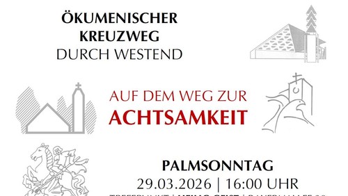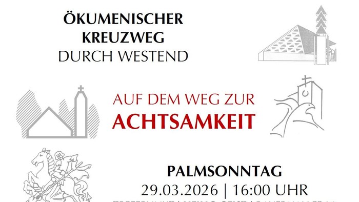 Palmsonntag, 29.03.2026, ab 16:00 Uhr - „AUF DEM WEG ZUR ACHTSAMKEIT“. Herzliche Einladung zum ökumenischen Kreuzweg durch Westend! Am Nachmittag des Palmsonntags werden wir wie in den vergangenen Jahren wieder durch unser Stadtviertel ziehen. Angesichts der Passion Jesu Christi wollen wir uns gemeinsam „auf den Weg machen zur Achtsamkeit“ und dabei versuchen, unseren Blick zu schärfen für die Benachteiligten in unserer Gesellschaft … Wir treffen uns um 16 Uhr vor dem Gemeindehaus von Heilig Geist, Bayernallee 28.