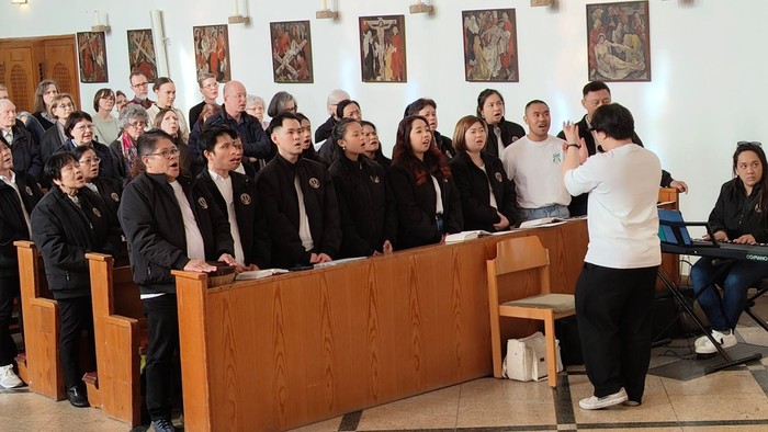 Am Vorabend des 4. Sonntag in der Osterzeit feierten die vier Teilgemeinden St. Salvator, St. Karl Borromäus, St. Canisius und Heilig Geist ihr Patrozinium. Der Abend war beschwingt und das lag zu einem guten Teil an der Musik: Der Singekreis um Carola Schmidt – Schimek sang oben auf der Empore und der Philippinische Chor unten vor dem Tabernakel. Die Sängerinnen und Sänger brachten mit den stimmungsvollen Liedern die Gemeinde zum fröhlichen Mitsingen.