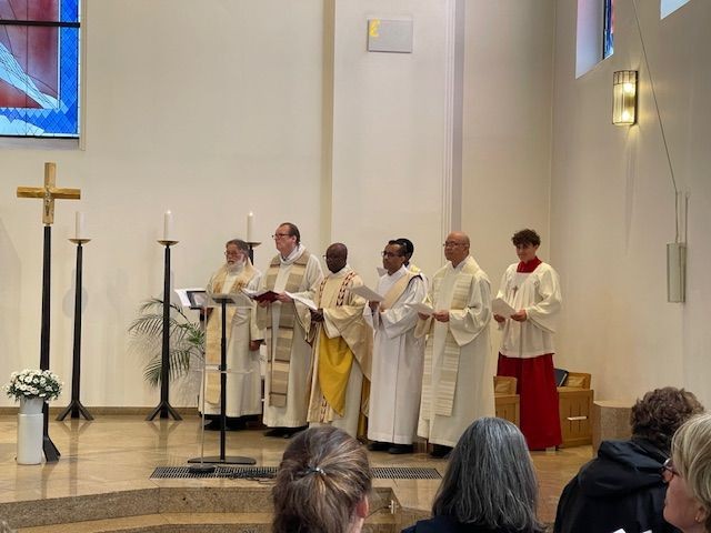 Der Neuzugang im Pastoralteam, Diakon Yohanes Paji SVD, trug das Evangelium vor. Die Verkündigung hatte diesmal der Pfarreirat übernommen. Renate Schmelzer, Sibylle Rooß, Christian Schwirten, Elke Heßdörfer und Karin Schubert predigten gemeinsam über den Namen unserer Pfarrei. Die Auferstehung Jesu, die Hoffnung des Christentums schlechthin, sind demnach Erbe und Auftrag für die Katholikinnen und Katholiken rund um den Funkturm. Das kam auch in den schönen Fürbitten zum Ausdruck, die originell von einem wunderbaren Klangteppich unterlegt waren und von Susanne Juppe-Ziervogel vorgetragen wurden.